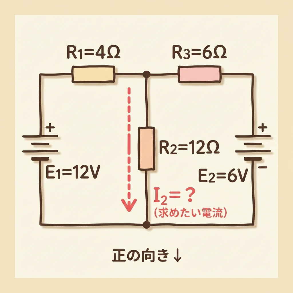 まず、R₂を流れる電流の正の向きを「上から下」と決めておきます。