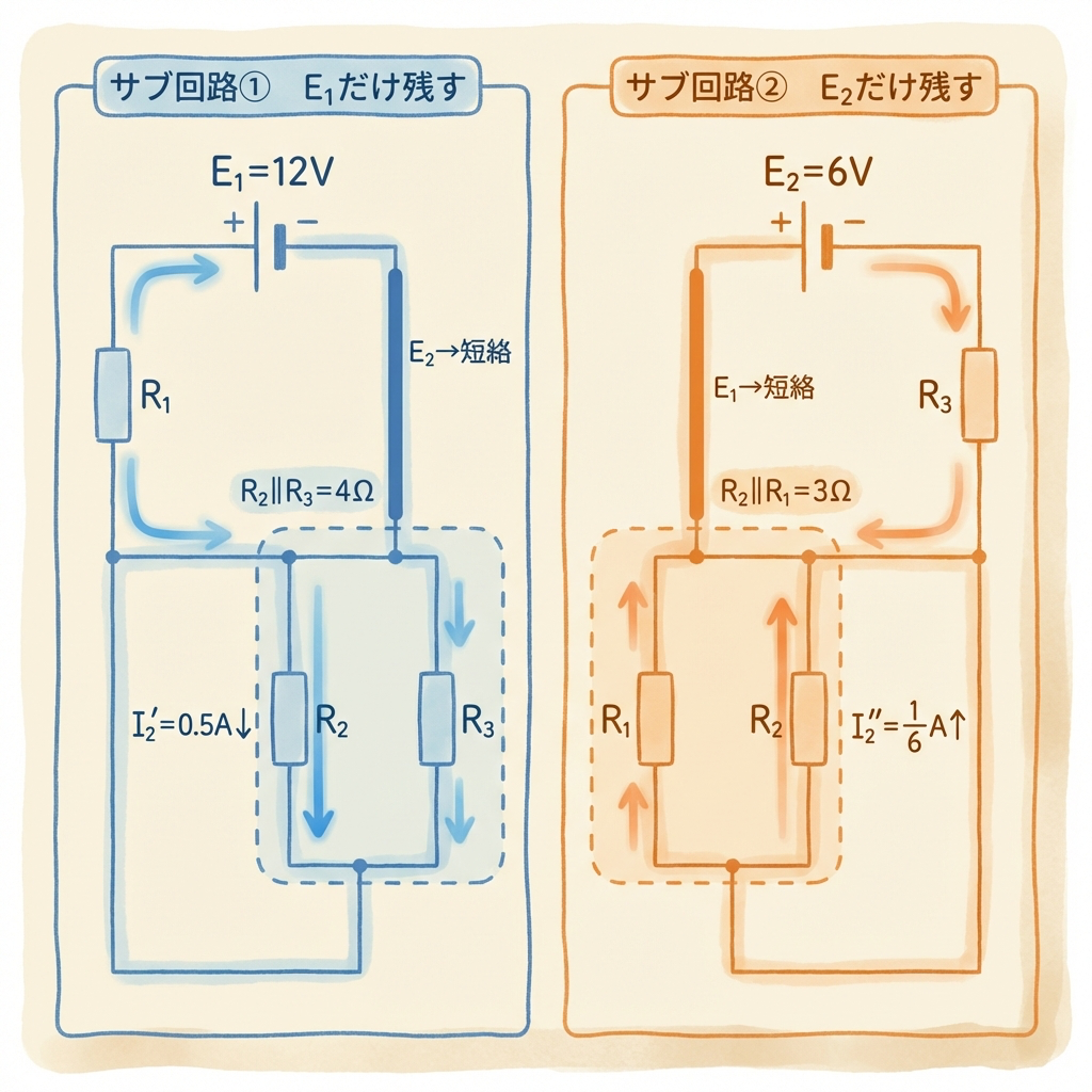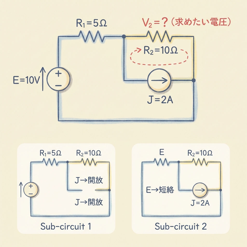 回路にn個の電源があれば、n通りの「サブ回路」を作ります。例えば電圧源E₁とE₂がある回路なら、以下の2つのサブ回路を作ります。