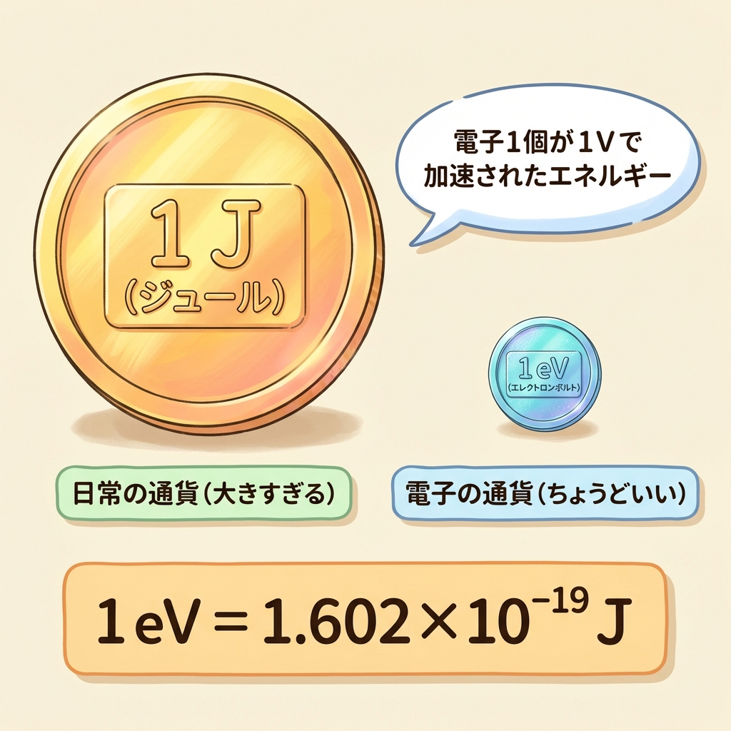 1 eV = e × 1V = 1.602 × 10⁻¹⁹ J日常で使うエネルギーの単位 [J](ジュール)は「1万円札」のような大きな単位。電子1個の世界では金額が小さすぎて扱いにくい。