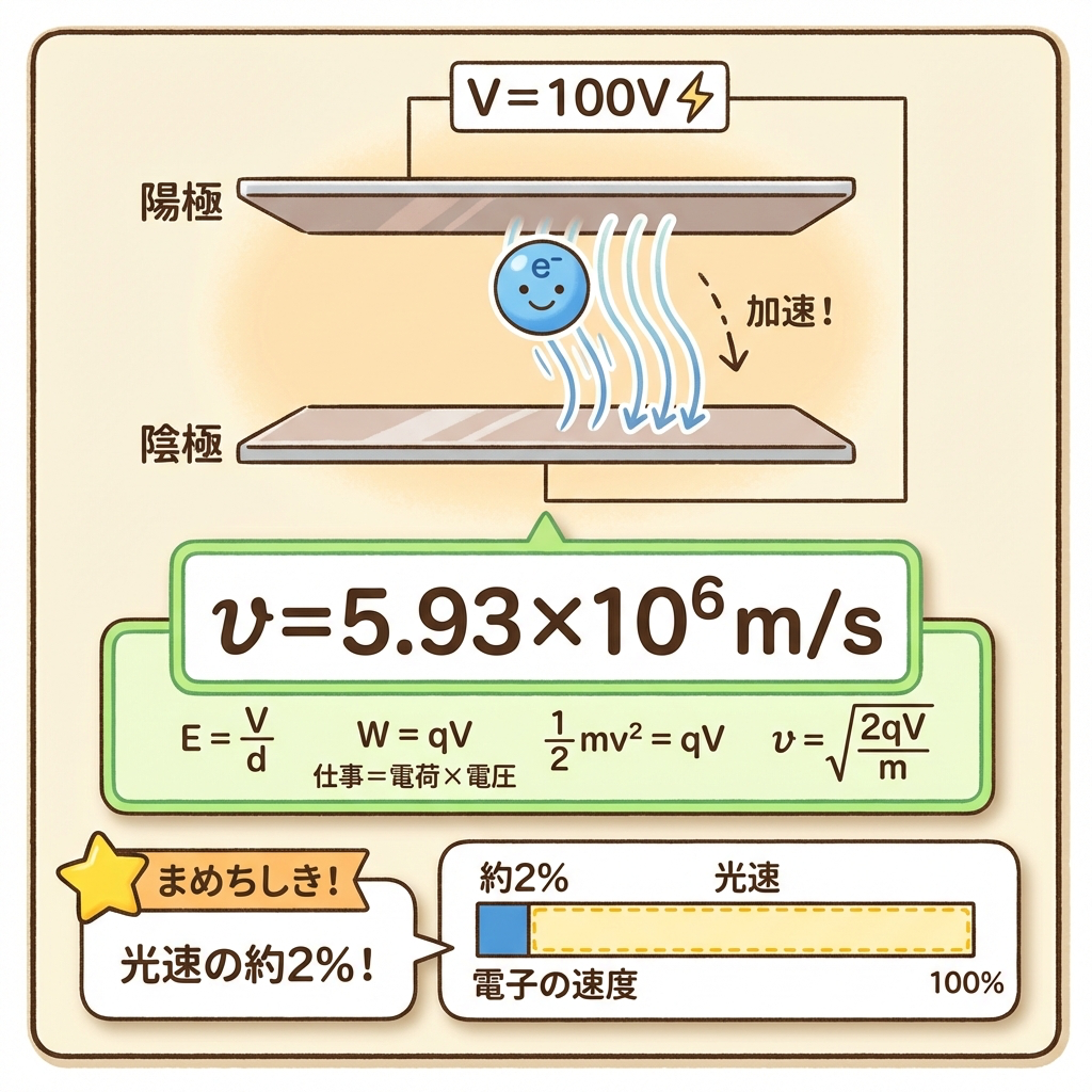 たった100Vの電圧で加速しただけで、電子の速度は約600万 m/s(光速の約2%)に達します。電子がいかに軽く、加速しやすいかがわかりますね。ブラウン管テレビの中で電子ビームがこのスピードで飛んでいたのです。