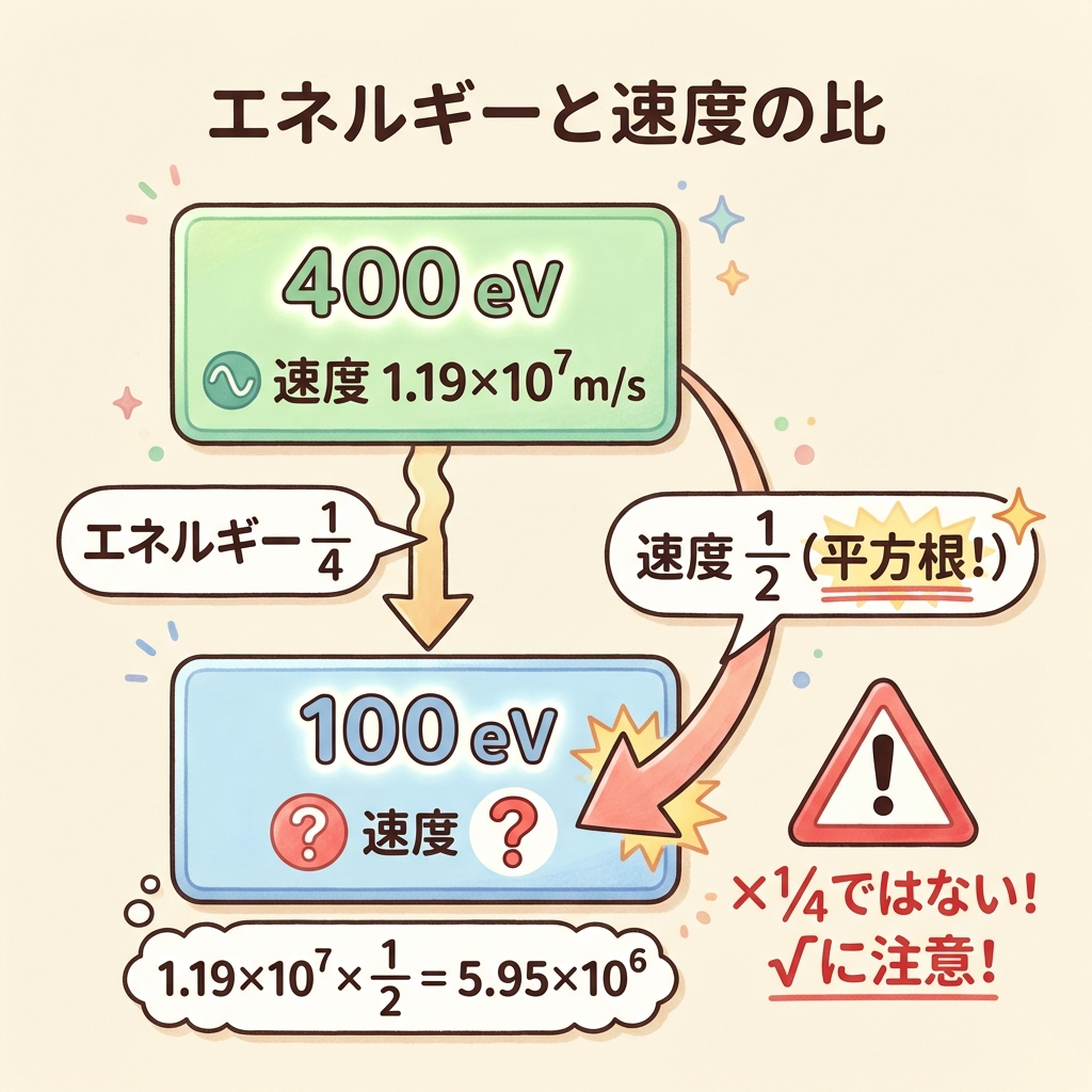 「100eVは400eVの1/4だから、速度も1/4」→ ×(速度は平方根に比例するので1/2)