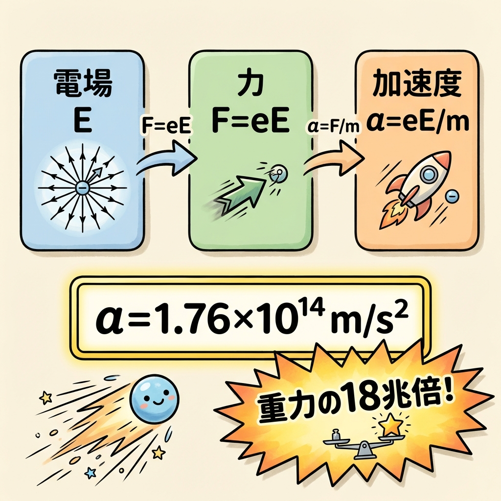 1.76 × 10¹⁴ m/s²。地球の重力加速度(9.8 m/s²)の約18兆倍です。力Fは極めて小さいのに、質量mも極めて小さいから、加速度が桁外れに大きくなる。これが電子の世界です。