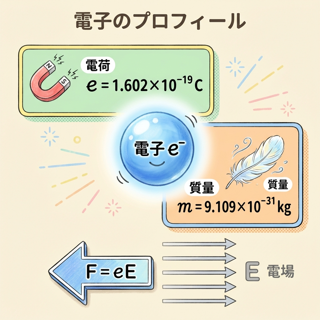 問題を解く前に、主人公「電子」のプロフィールを押さえましょう。この2つの数値は試験で必ず与えられますが、意味を理解しておくと格段に解きやすくなります。
