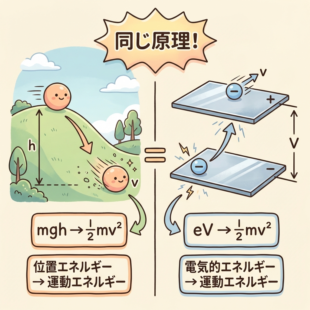 ① eV = ½mv² は「坂道を転がるボール」と同じ原理。電圧Vが坂の高さ、電子eがボール。坂が高いほど速くなる。