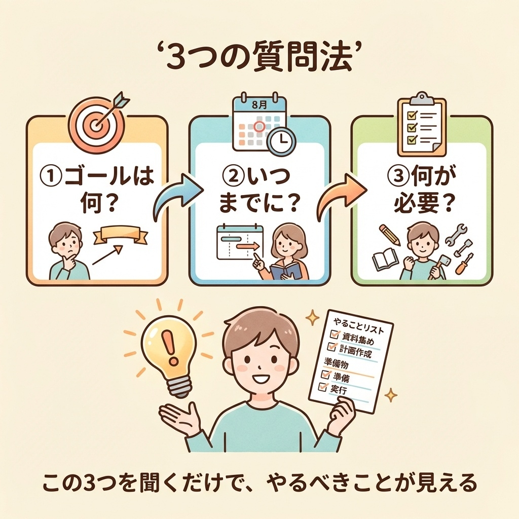 次に新しい仕事を振られたとき、ぜひ「ゴールは何?いつまでに?何が必要?」と自分に問いかけてみてください。