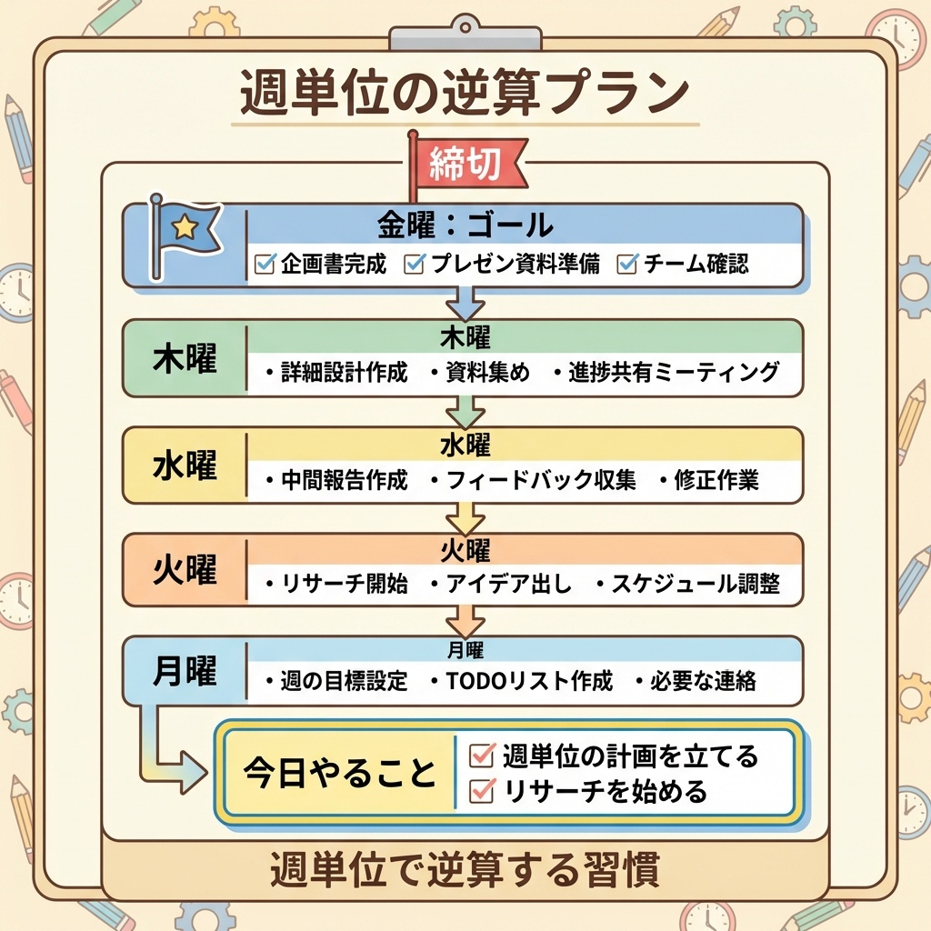 | 火曜 | 構成決定・ドラフト作成 | 方向性を固めてから作業 |