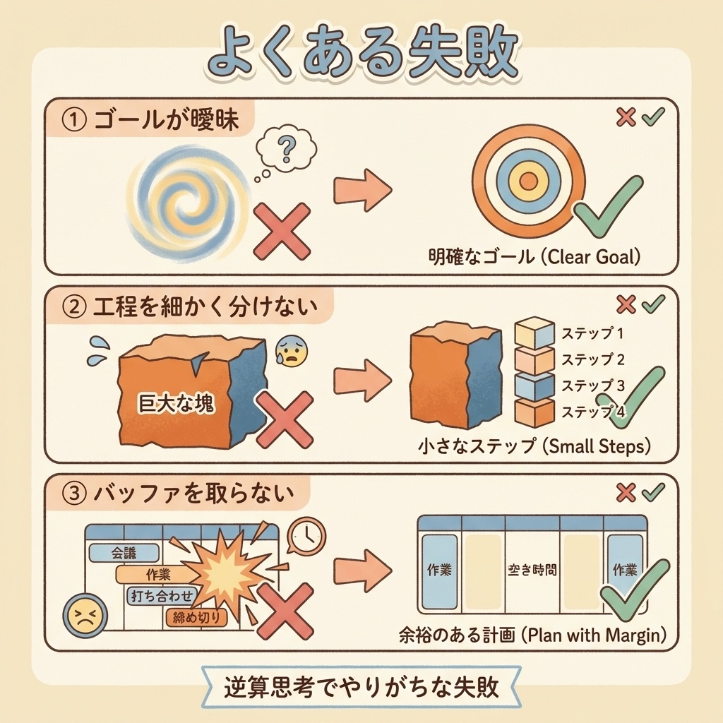 最後に、逆算思考を始めた人がやりがちな失敗を3つ紹介します。