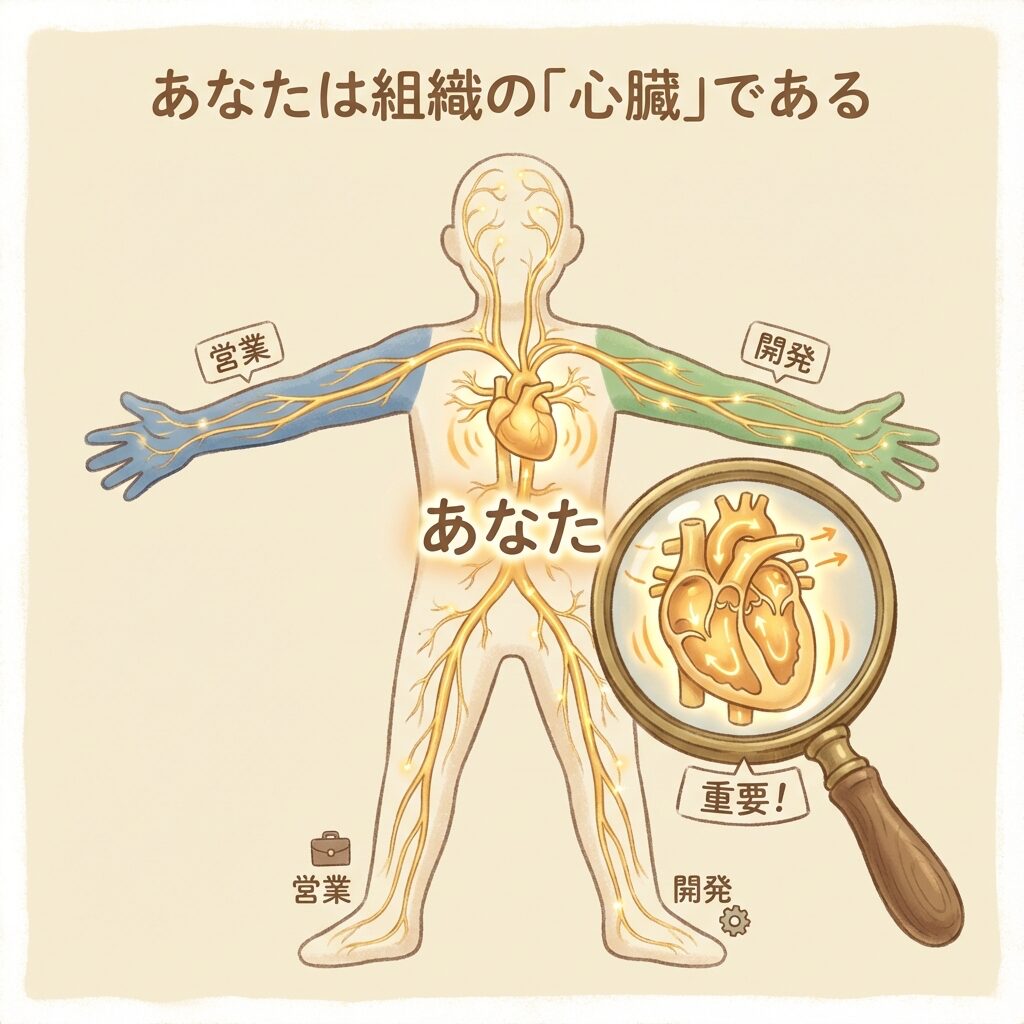 あなたは「心臓」です。目には見えないけれど、24時間休むことなく、組織全体に血液を送り続けている。