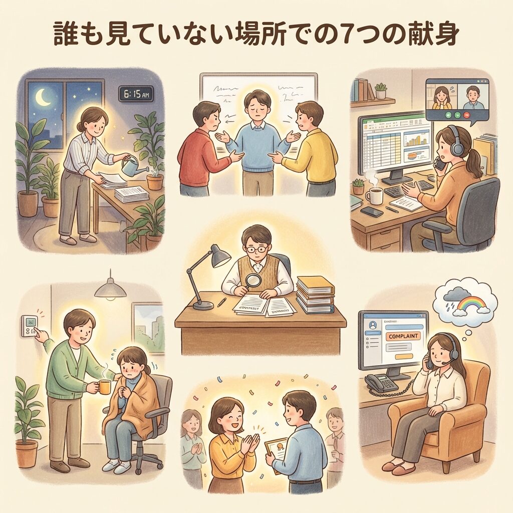 あなたが助けた新人は、いつか誰かを助ける人になるかもしれない。あなたが防いだ炎上は、多くの人のストレスを未然に防いだ。あなたの気配りは、誰かの「今日も頑張ろう」という気持ちを支えた。