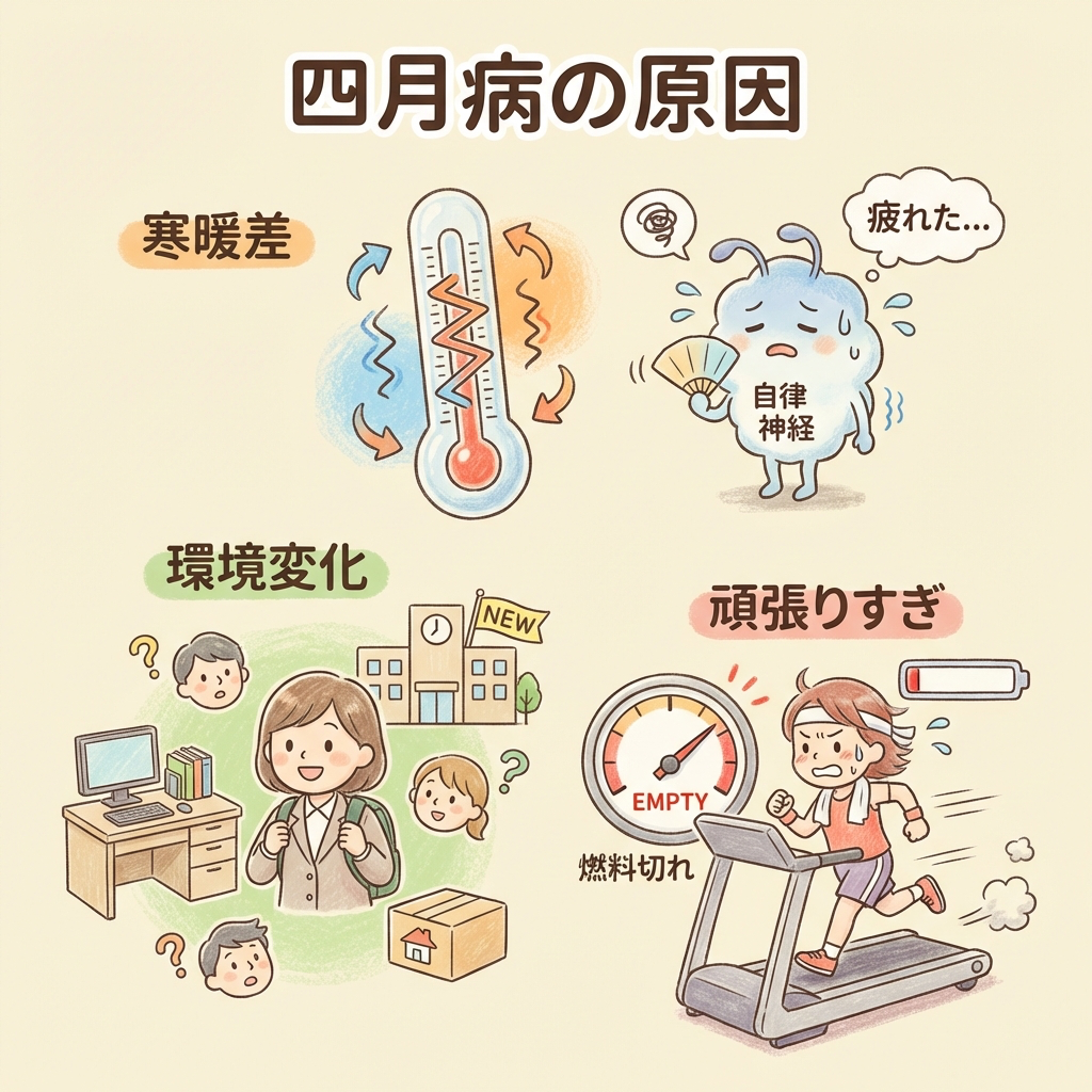 3〜4月は1日の寒暖差が10℃以上になることも珍しくありません。朝はコートが必要なのに、昼はシャツ1枚で汗ばむ。この激しい気温差に体を適応させるために、自律神経がフル稼働します。