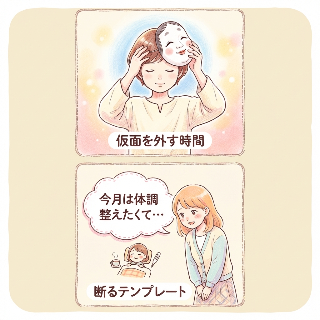 - もし「飲み会どうする?」と聞かれたら → 「今月は体調を整えたいので」と断る