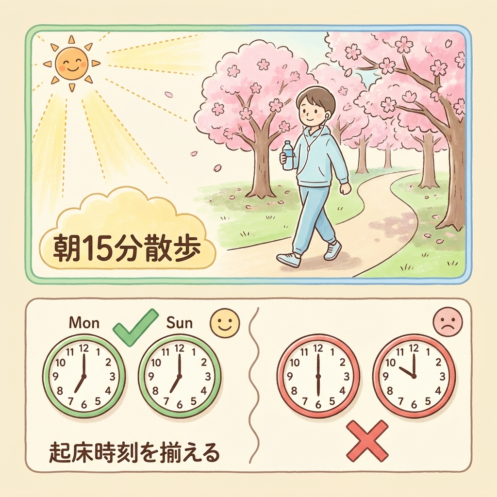 朝日を浴びながら15分歩くだけで、脳内にセロトニン(安定ホルモン)が分泌され、体内時計がリセットされます。「散歩」というと大げさに聞こえますが、通勤で1駅分歩くだけでOKです。