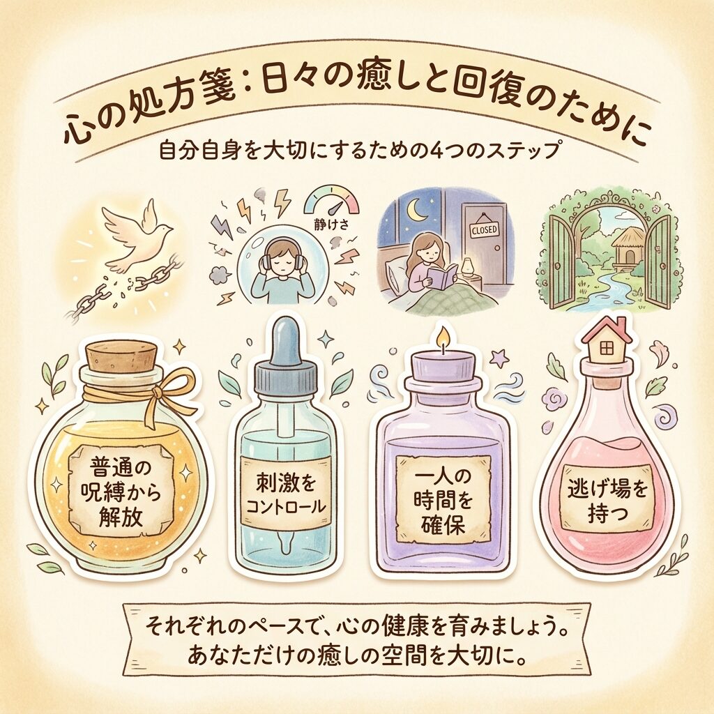 - 生きづらさを和らげるには、刺激のコントロール、一人時間の確保、環境選びが重要