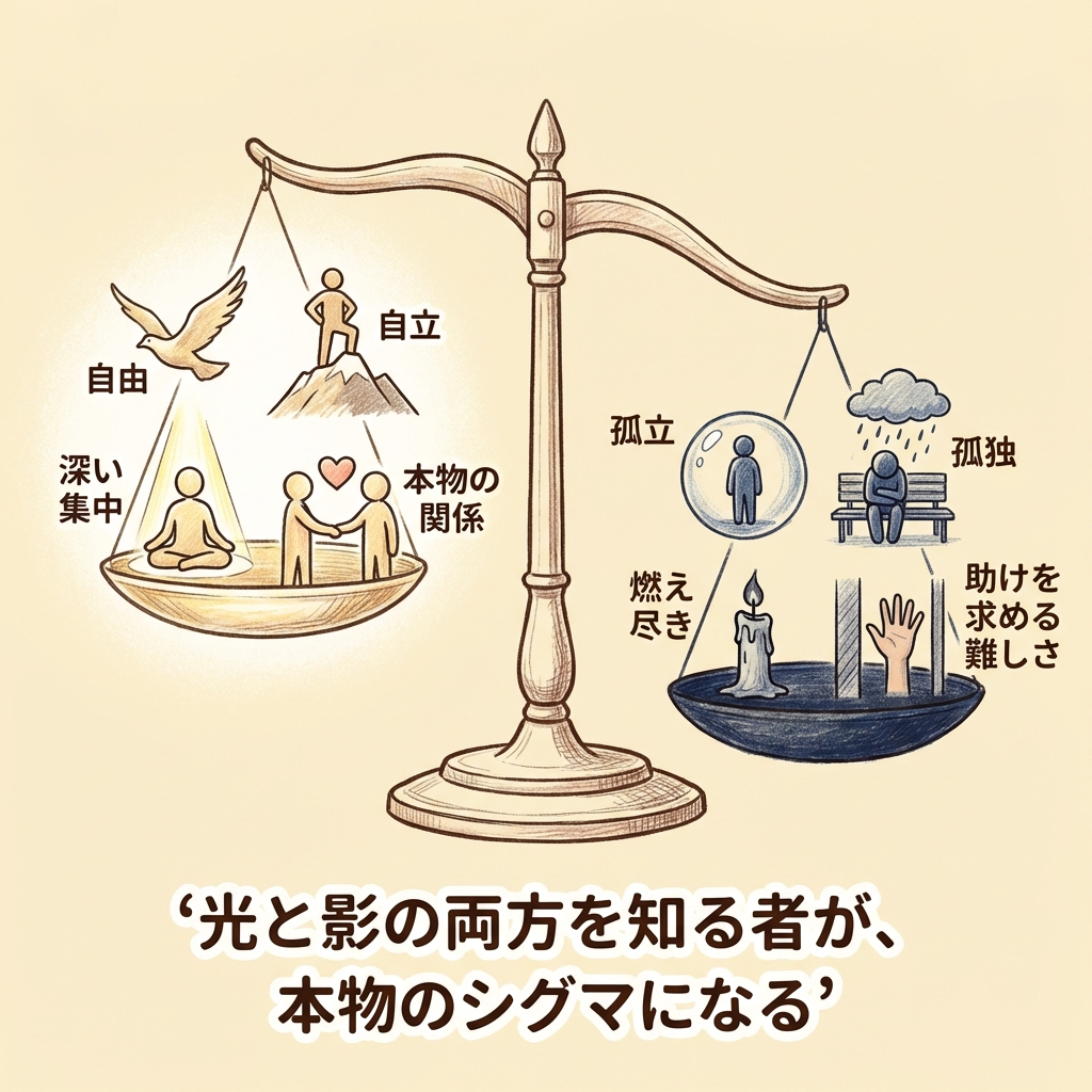 ここまでシグマ男性の良い面を語ってきましたが、正直に「闇」の部分も書いておきます。これを知らずにシグマを目指すと、取り返しのつかない孤立に陥る可能性があります。