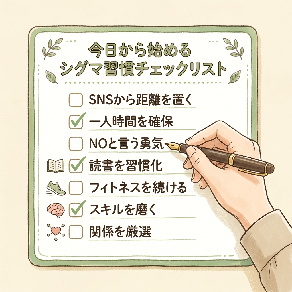 シグマ男性とは「演じるキャラ」ではなく、自分軸で生きる覚悟の結果として現れる在り方です。SNSの通知をオフにし、一人の時間を確保し、断る力を磨き、知性と身体を鍛え、経済的自立を手に入れ、人間関係を精鋭化する──この7つの習慣を地道に積み重ねれば、あなたは「シグマ男性になる」のではなく、気づいたらシグマ男性になっているはずです。
