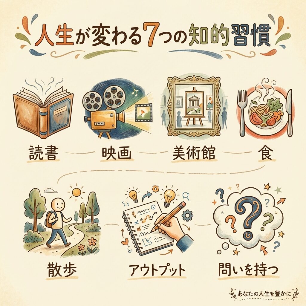 - 教養を育てる7つの習慣:読書、映画、美術館、食の探求、散歩、アウトプット、問いを持つ