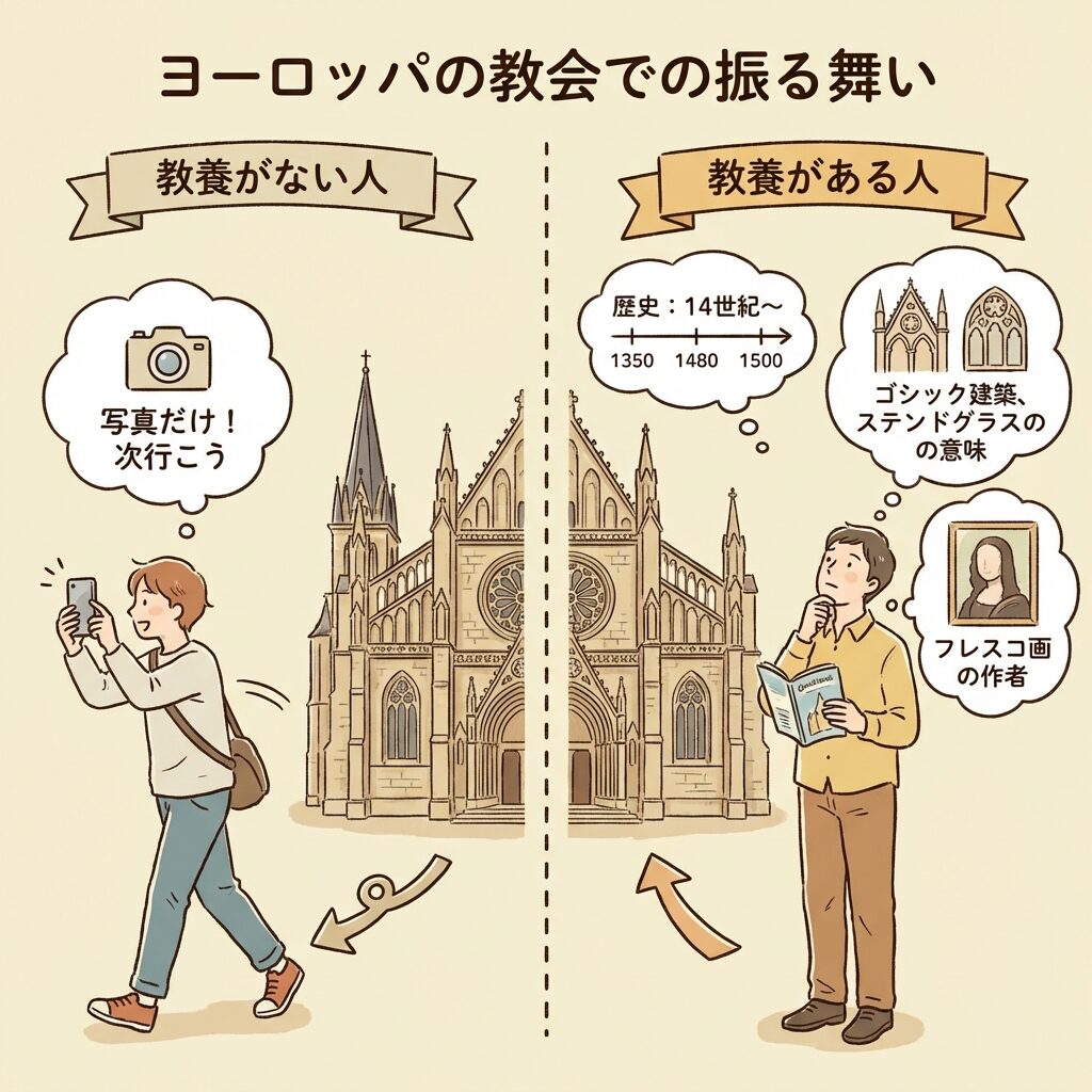 | 「きれいな建物だな〜」で終わる | 「この建築様式はゴシック様式だ。12世紀にフランスで生まれて…」と背景が見える |
