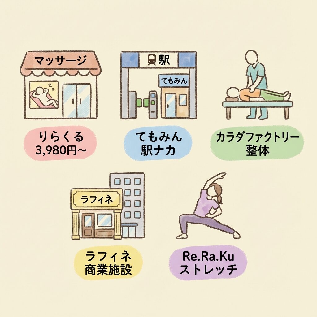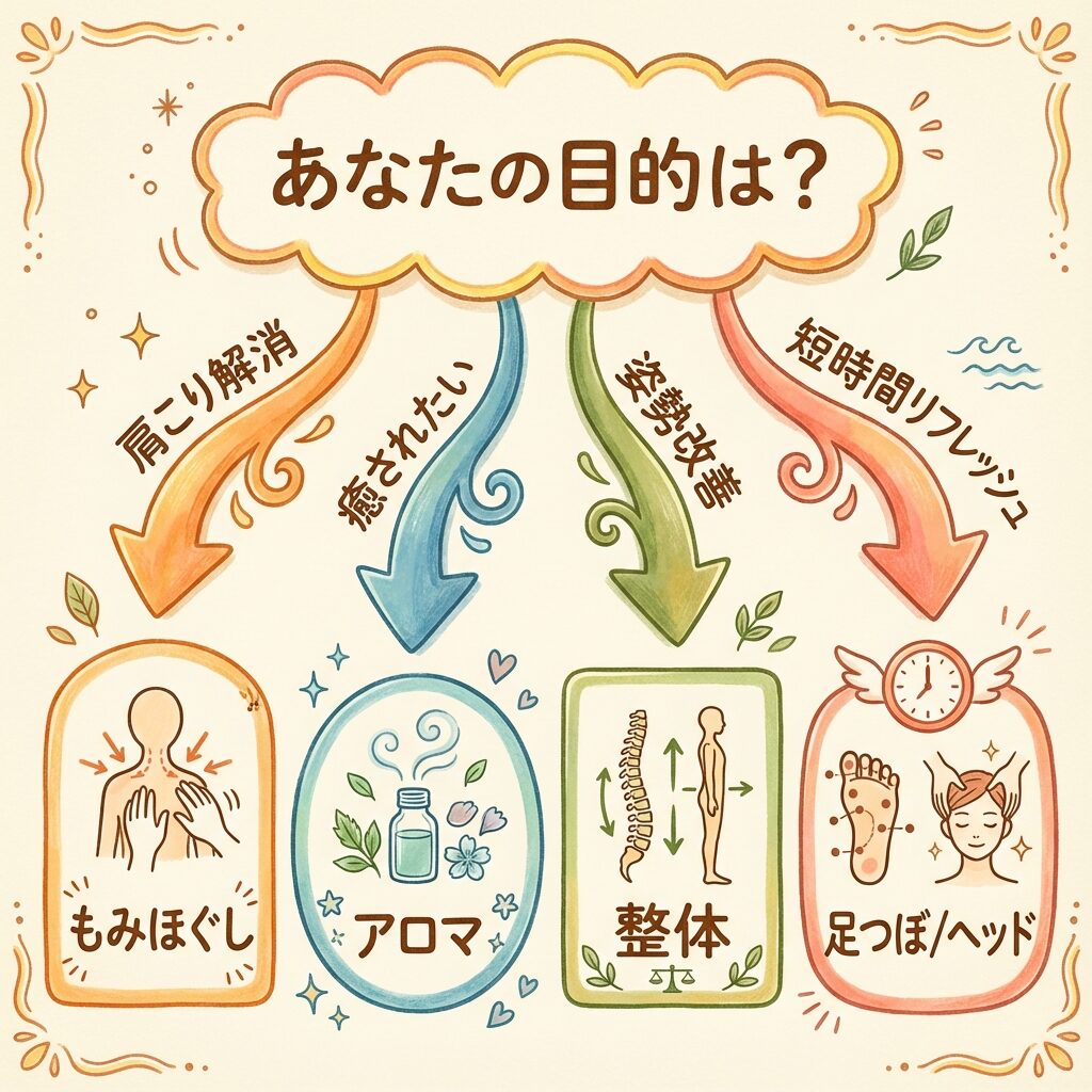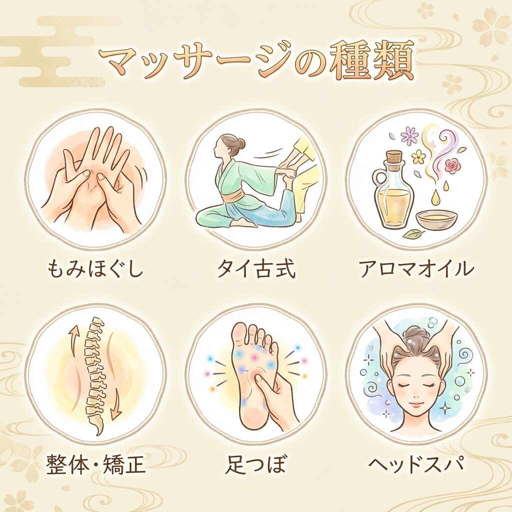 • 種類によって効果が違う:もみほぐし、タイ古式、アロマ、整体、足つぼ、ヘッドスパ
