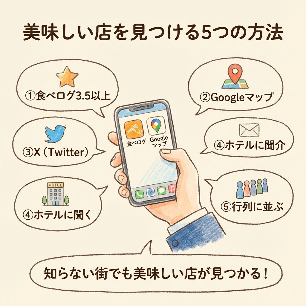 → 食べログ3.5以上、Googleマップ、X、ホテルに聞く、行列に並ぶ