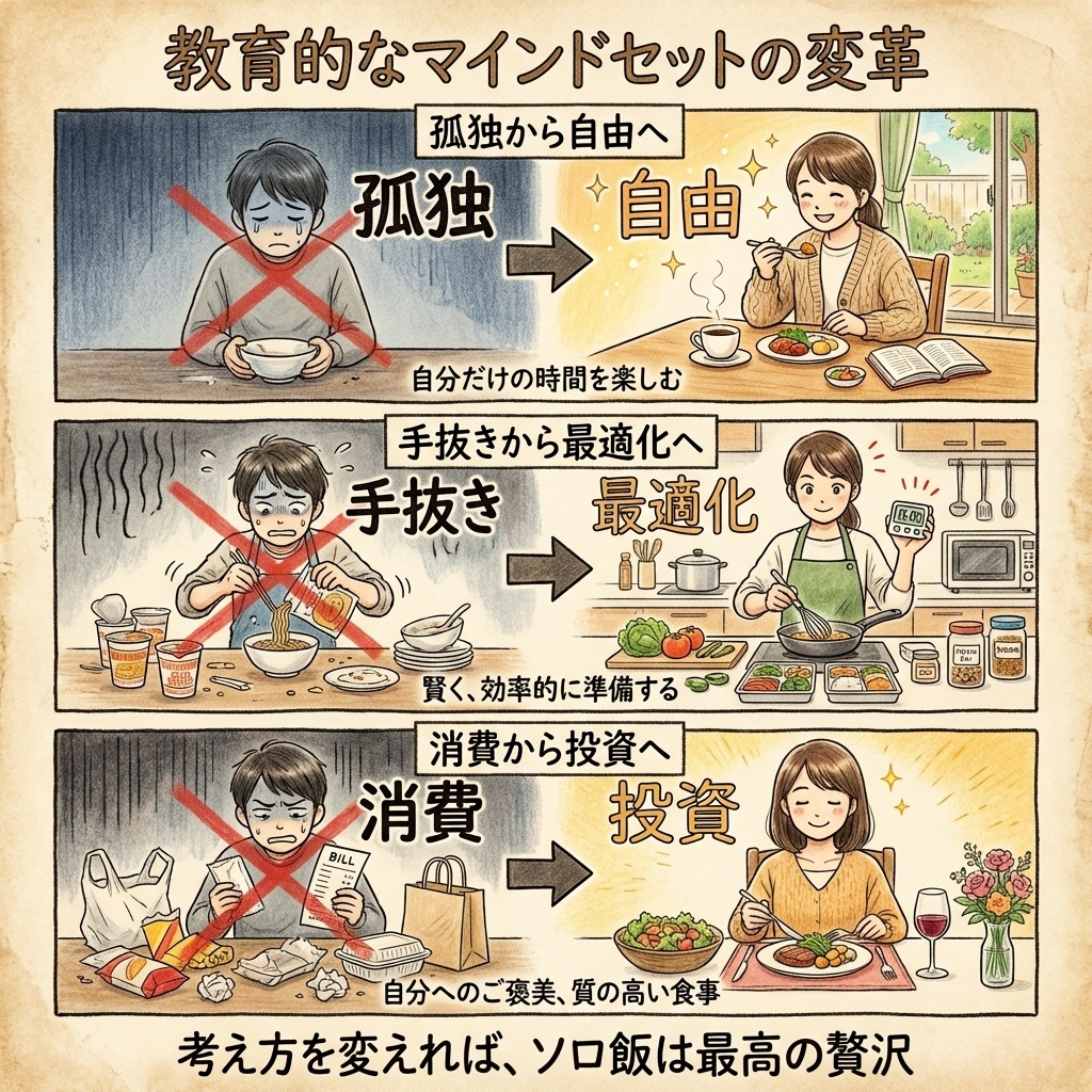 一人で食べることは「寂しい」のではなく、「誰にも気を遣わなくていい自由」です。好きなものを、好きなペースで、好きなだけ。これは誰かと一緒では得られない贅沢。