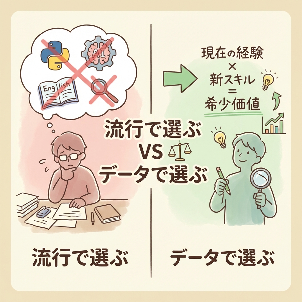 30代のリスキリングで最もコスパが高いのは、「今の経験 × 新しいスキル」の掛け算です。例えば、製造業の品質管理経験者が統計学やデータ分析を学ぶのと、ゼロからWebデザインを学ぶのでは、転職市場での「希少性」がまったく違います。前者は「実務経験+専門スキル」の掛け算で希少価値が出ますが、後者は未経験の20代と同じ土俵で戦うことになります。