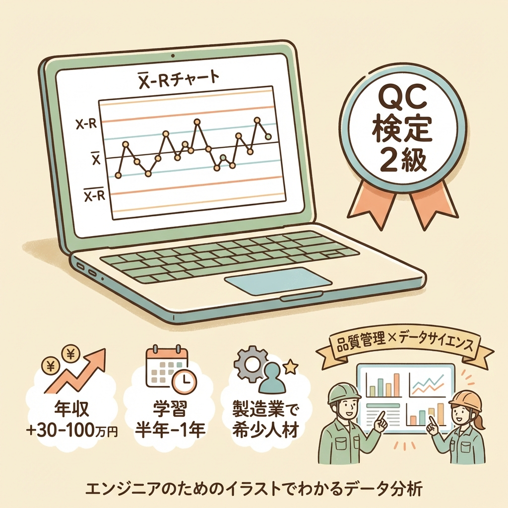 QC検定(品質管理検定)は、品質管理の知識を体系的に証明する検定試験です。2級を取得すると、管理図・実験計画法・抜取検査・検定推定など統計学の実務スキルが身につき、品質管理部門への異動・昇進、または品質管理職としての転職が現実的になります。