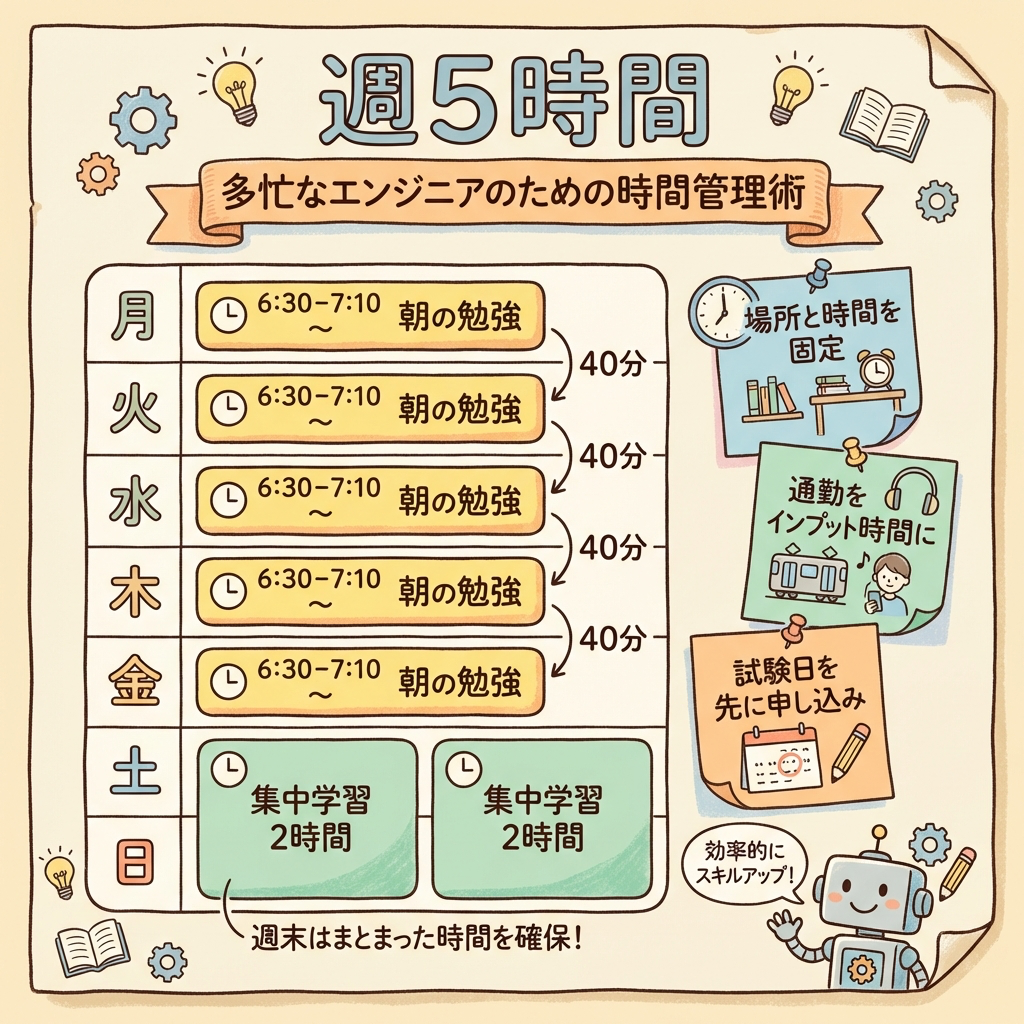 「学ぶべきものはわかった。でも時間がない」──これが最大のボトルネックです。結論から言えば、週5時間(平日40分×5日 or 平日30分×4日+休日2時間)を半年続ければ、QC検定2級は合格圏に入ります。電験三種は1年〜1年半です。