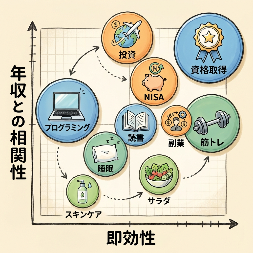 でも、その「大事」の具体的な中身を、データで示してくれる人はほとんどいません。「読書しろ」「筋トレしろ」「英語やれ」「資格取れ」……全部正しそうで、全部手をつけられない。30代の独身男性が月に自由に使える数万円を、最も効率よくリターンに変えるには、何に投じればいいのか。