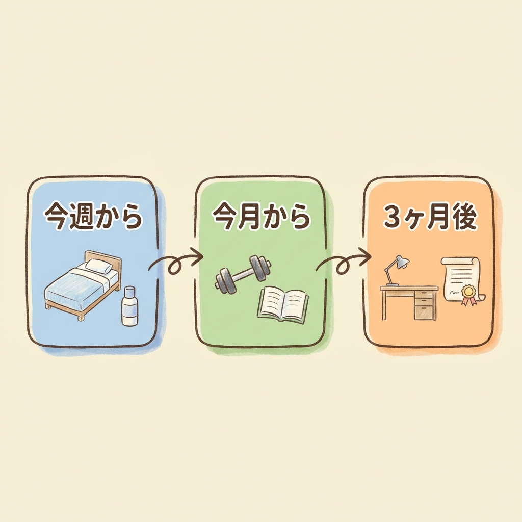 土台を整える:睡眠環境の見直し(枕・マットレスの検討)、スキンケアの最低限セットを購入。これだけで毎日の「体調の質」が変わります。合計投資額は初月のみ1〜3万円。