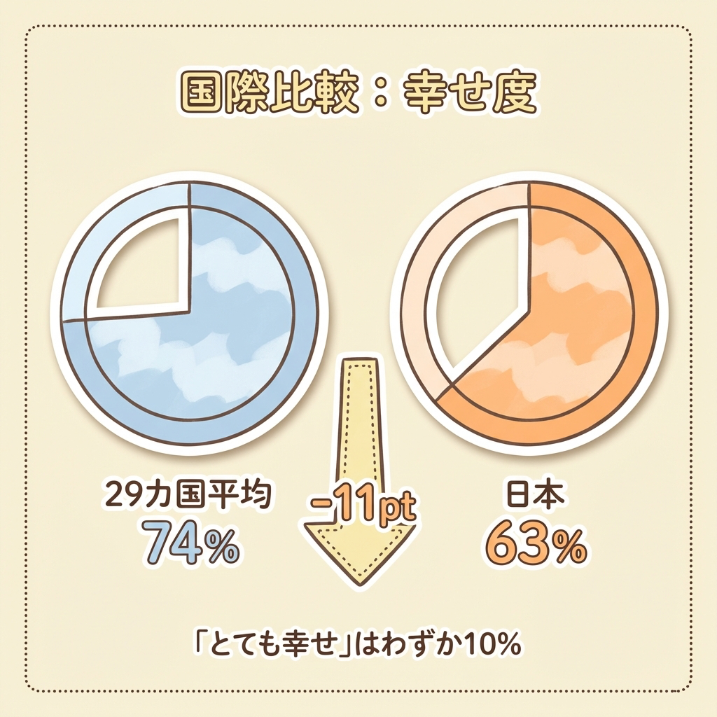 国際調査会社Ipsosが29カ国・約23,000人を対象に実施した「Global Happiness Index 2026」(2026年3月発表)。「自分は幸せだ」と回答した日本人は63%。29カ国平均74%を11ポイント下回り、ワースト3位でした。