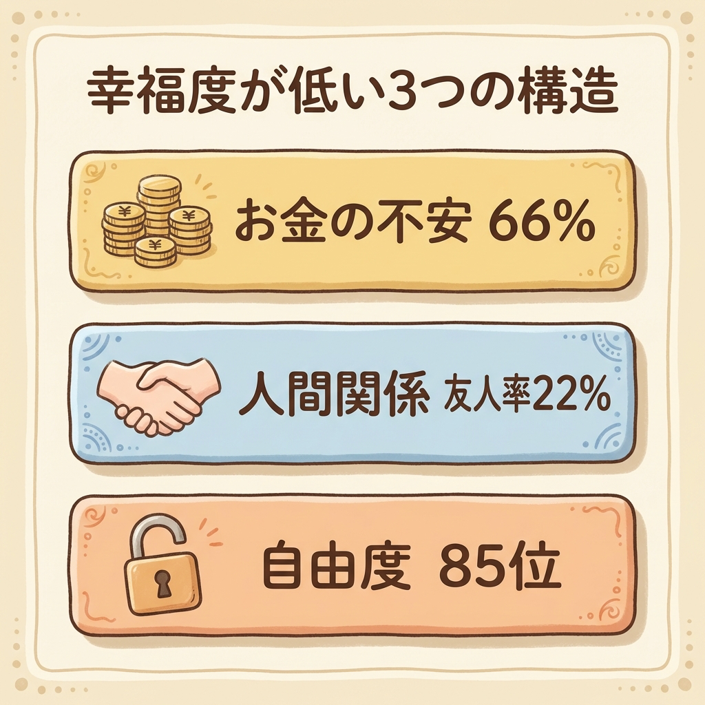 • 幸福度が低い3つの構造的な原因(お金・人間関係・自由度)