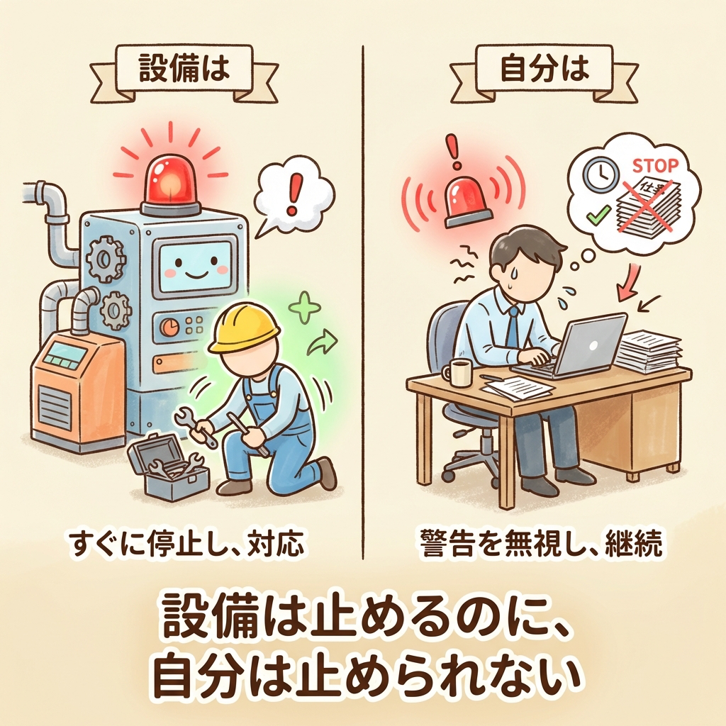 あなたは毎日、設備の異常データを見て判断しているはずです。閾値を超えたら停止する。それは「逃げ」とは呼びませんよね。自分の心に対しても、同じ判断をしてください。