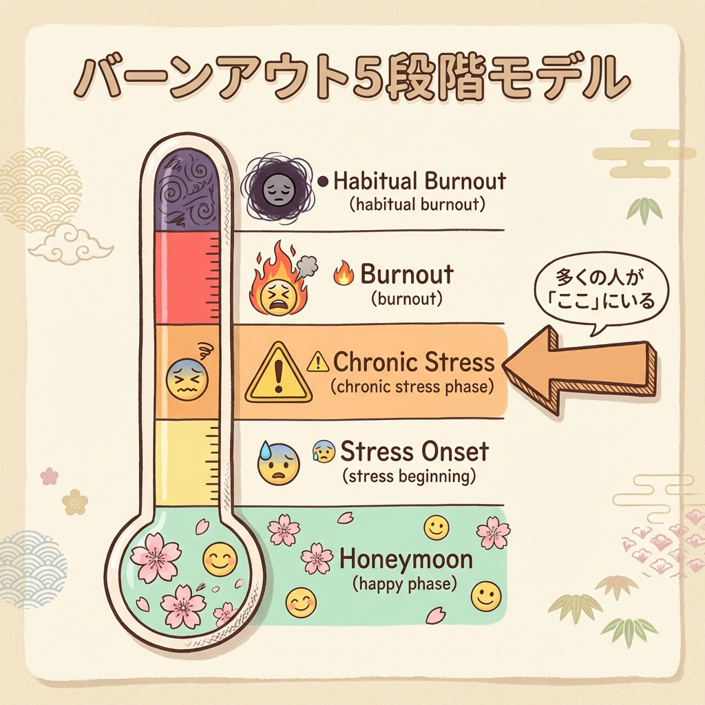 - バーンアウト(燃え尽き症候群)の5段階モデルで、今の自分の位置を知る