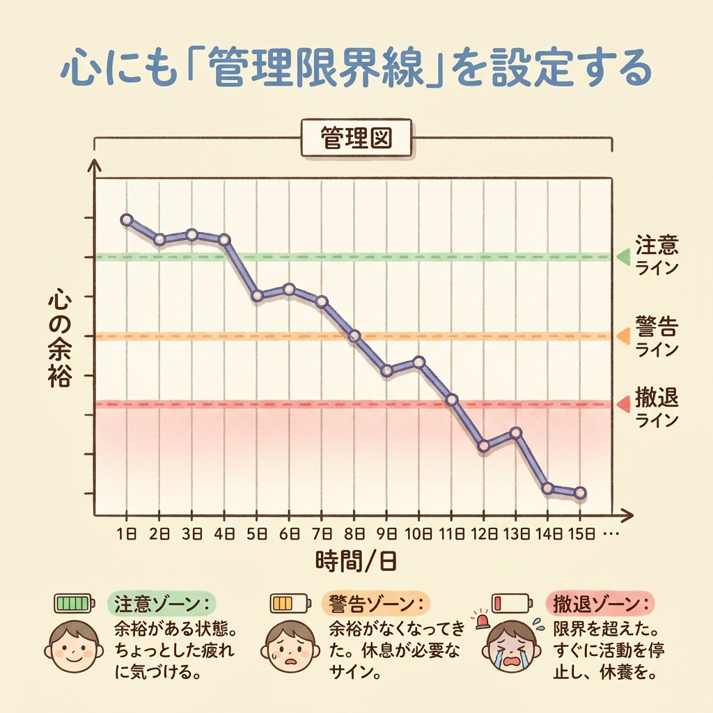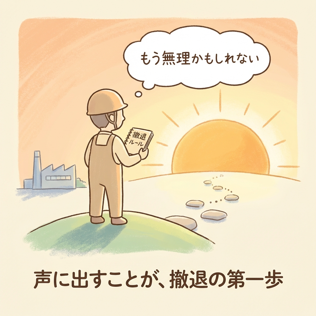 データに基づく判断。自分の限界サインを観測し、事前に設定した撤退ラインに従って行動すること。これは工場の「設備停止判断」と同じ——冷静な、プロフェッショナルの判断。