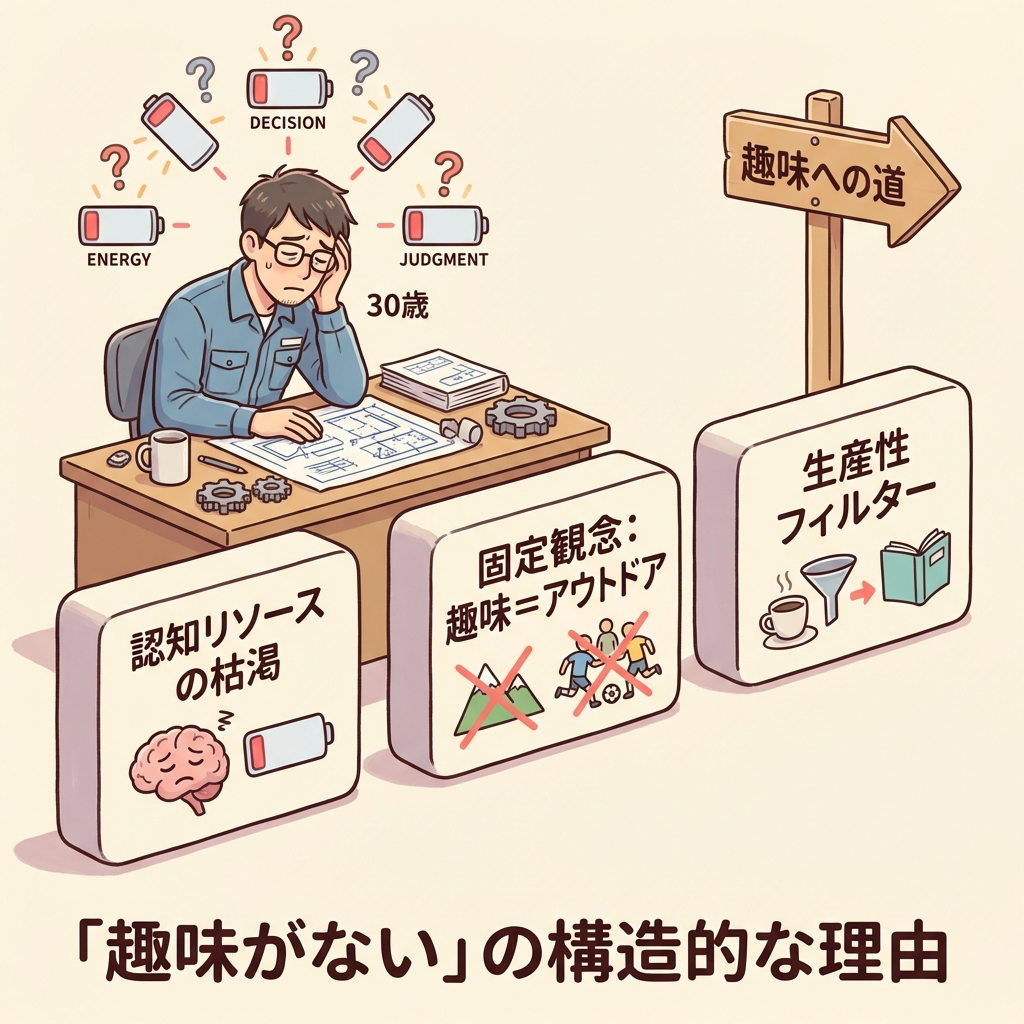 「趣味がない」のは、あなたの性格や怠惰のせいではありません。30代メーカーエンジニアという環境に、構造的な原因が3つあります。