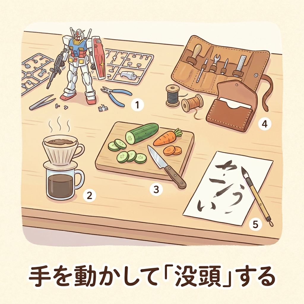 仕事のストレスを忘れたいなら、「手を動かして何かを作る」趣味が最強です。認知リソースが「目の前の作業」に100%向くため、余計な思考(仕事の不安、SNSの比較)が物理的に入り込めなくなります。