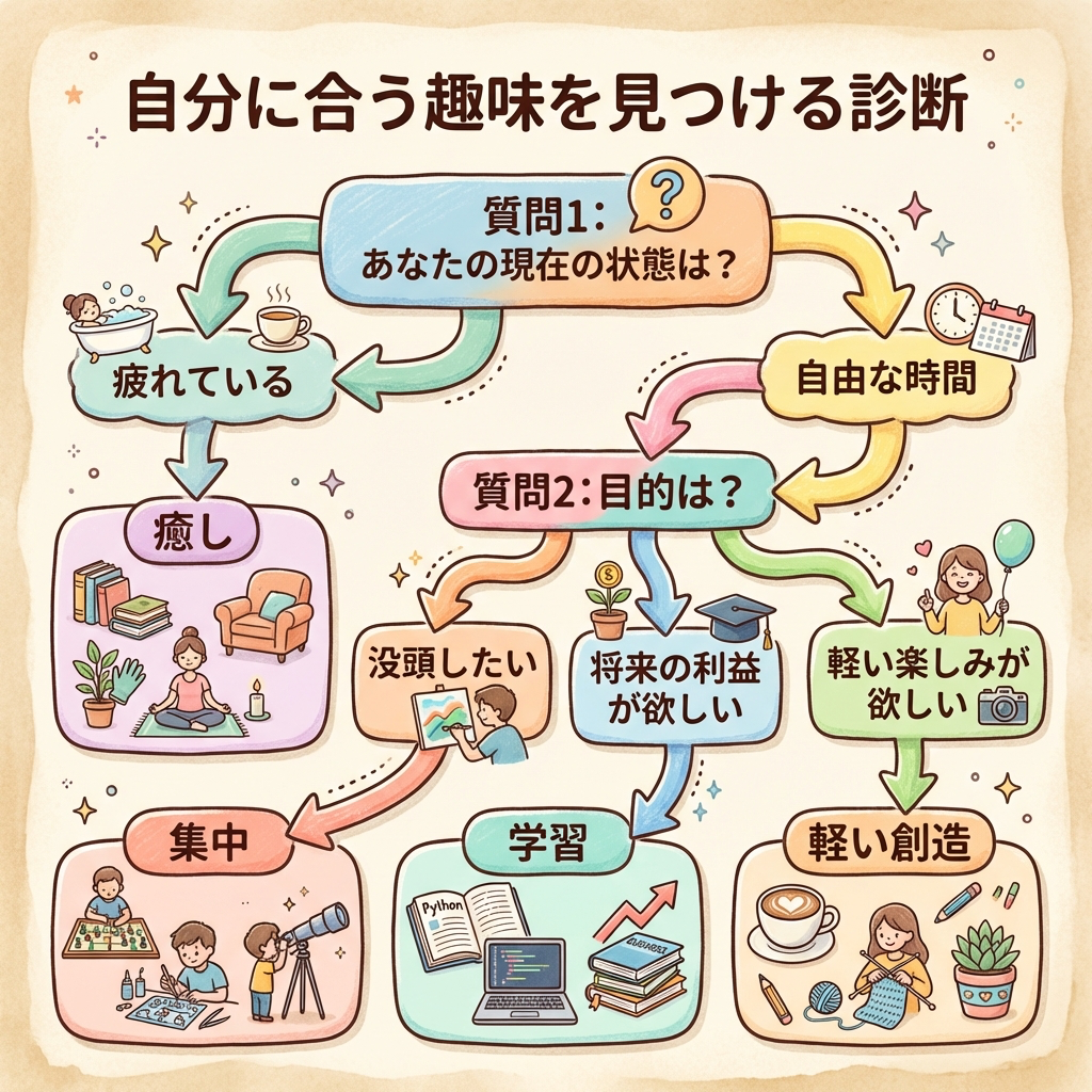 15個もあると迷いますよね。以下のフローチャートで、今のあなたに最も合う趣味を絞り込みましょう。