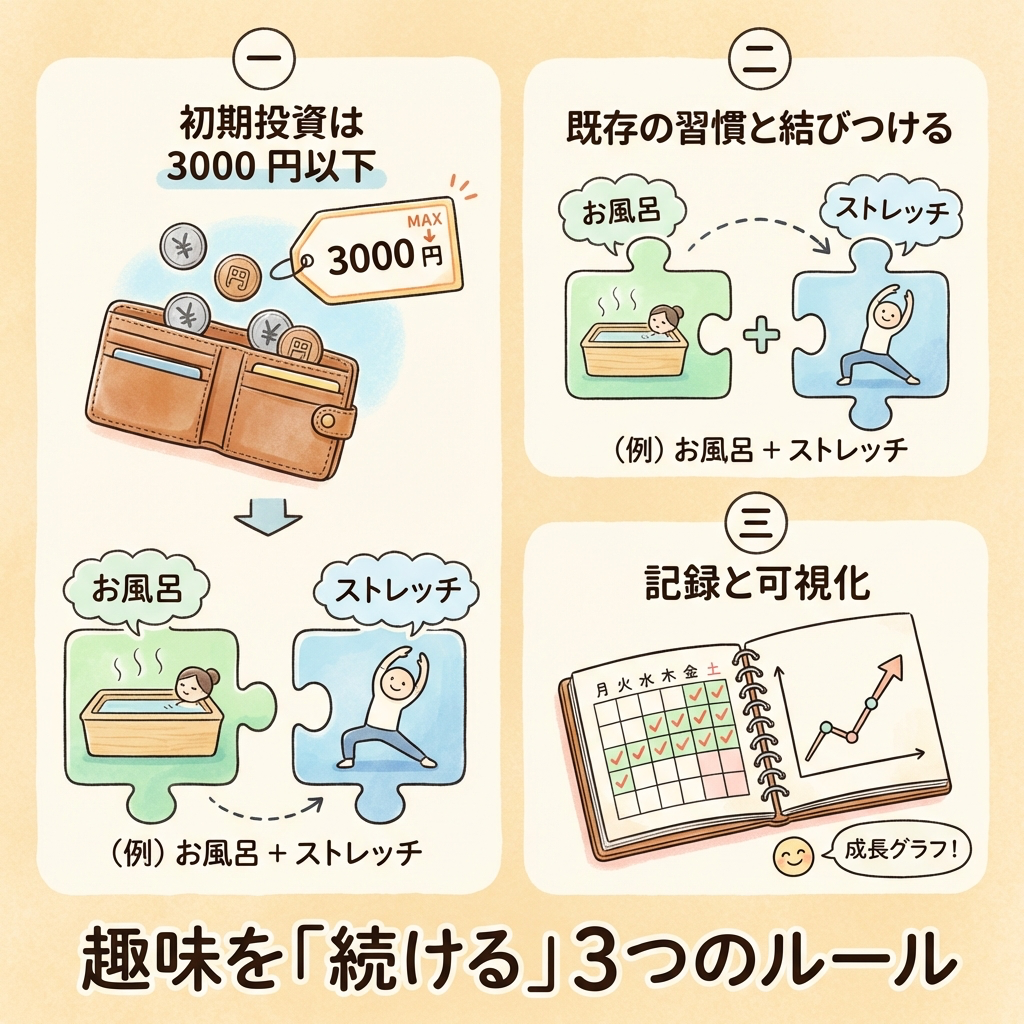 多くの人が「趣味を始めてみたけど3日で飽きた」を繰り返しています。これは意志力の問題ではなく、仕組みの問題です。以下の3つのルールを守るだけで、続く確率が格段に上がります。