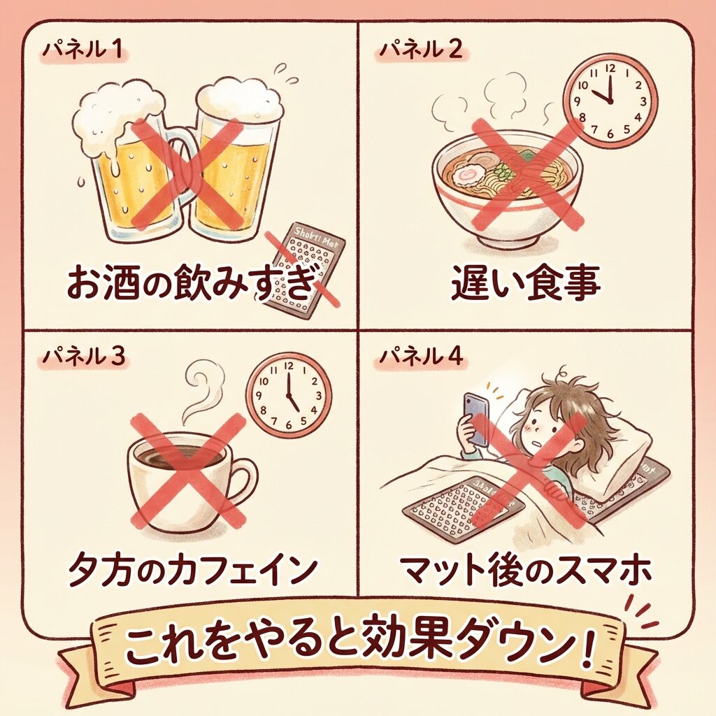 - ただし、お酒・遅い食事・カフェインで効果ダウン