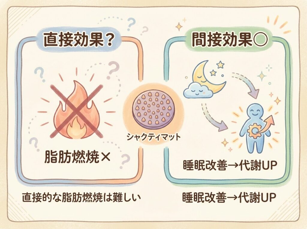 シャクティマットを使っても「寝ているだけで脂肪が燃える」ことはありません。しかし、睡眠の質が上がることでホルモンバランスが整い、食欲コントロールがしやすくなるという間接的なダイエット効果は期待できます。「痩せる魔法のマット」ではなく、「痩せやすい体質をつくるサポートツール」として捉えるのが正解です。