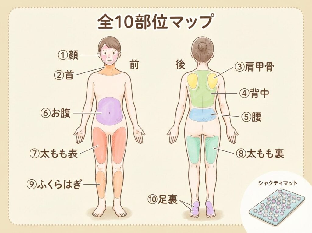 まずは、シャクティマットで使える全10部位を一覧で確認しましょう。