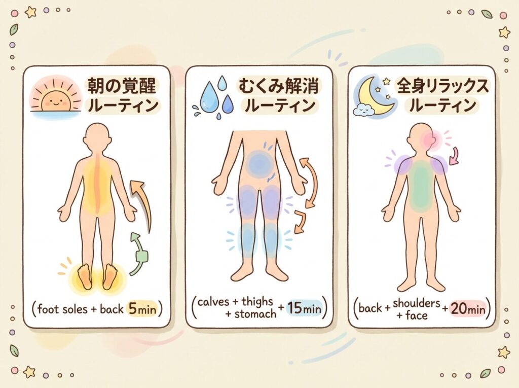 シャクティマットは「背中だけ」で使うのはもったいない。顔のむくみ解消、お腹の腸活サポート、太もものセルライトケア、足裏の疲労回復など、部位ごとに違う効果が得られます。基本は背中で10〜20分、慣れてきたら悩みに合わせて他の部位にも挑戦してみましょう。