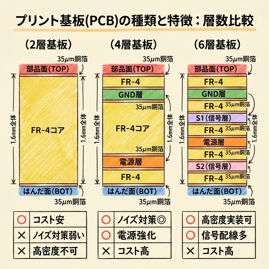 コストを優先して2層にしたら、EMC試験で不合格…という失敗談は多いです。やり直しのコストは新規設計の3〜5倍かかることも。最初から適切な層数を選ぶ方が、トータルでは安上がりです。