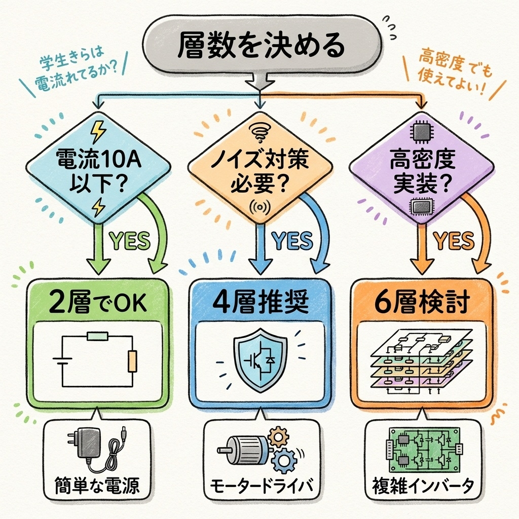 実は、層構成の決め方には明確な判断基準があります。「電流値」「ノイズ要件」「実装密度」の3つを見れば、最適な層数が見えてくるのです。