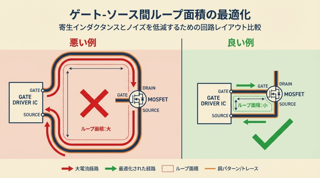🔄 対策①:ゲート・ソース間ループ面積を最小化する