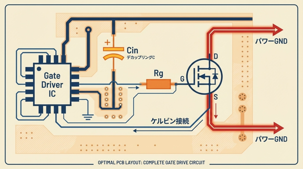 ┌──────────────────────┐ │ ゲートドライバIC │ └──────────┬───────────┘ │ ゲート配線 │ (長い!) │ ↓ ┌─────────┐ │ MOSFET │ └────┬────┘ │ ソース配線 (また長い!) │ ↓ ──────────────────── GND