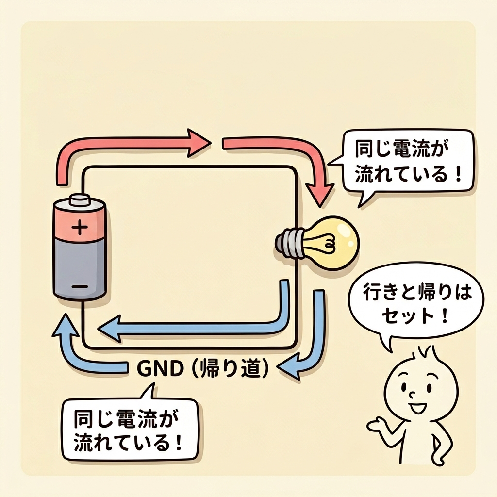 GNDを理解するための第一歩は、「電流は必ず1周する」という大原則を思い出すことです。