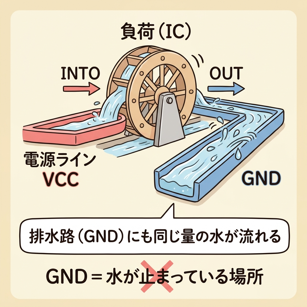 「排水路には水が流れていない」と思う人はいませんよね。給水路から送った水は、必ず排水路を通って帰ってきます。GNDも同じです。電源ラインを通って送り出された電流は、必ずGNDを通って電源に帰ります。