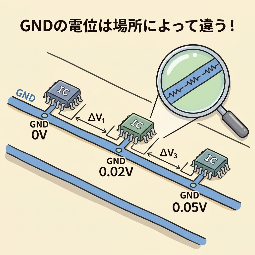 GNDとは「電流が電源に戻るための帰り道」です。「0Vの線」ではありません。帰り道である以上、そこには電流が流れます。電流が流れれば、配線のわずかな抵抗やインダクタンスによって電圧降下が生じ、GNDの電位は「場所によって違う」のです。この事実を理解しているかどうかが、ノイズに強い回路を設計できるかどうかの分かれ目になります。