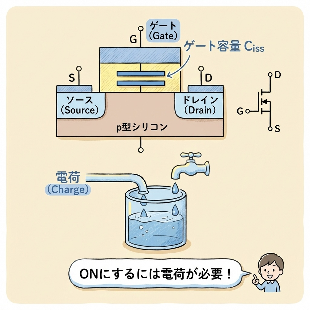 ここが最重要ポイントです。MOSFETのゲートは、電気的には「コンデンサ」と同じ構造をしています。